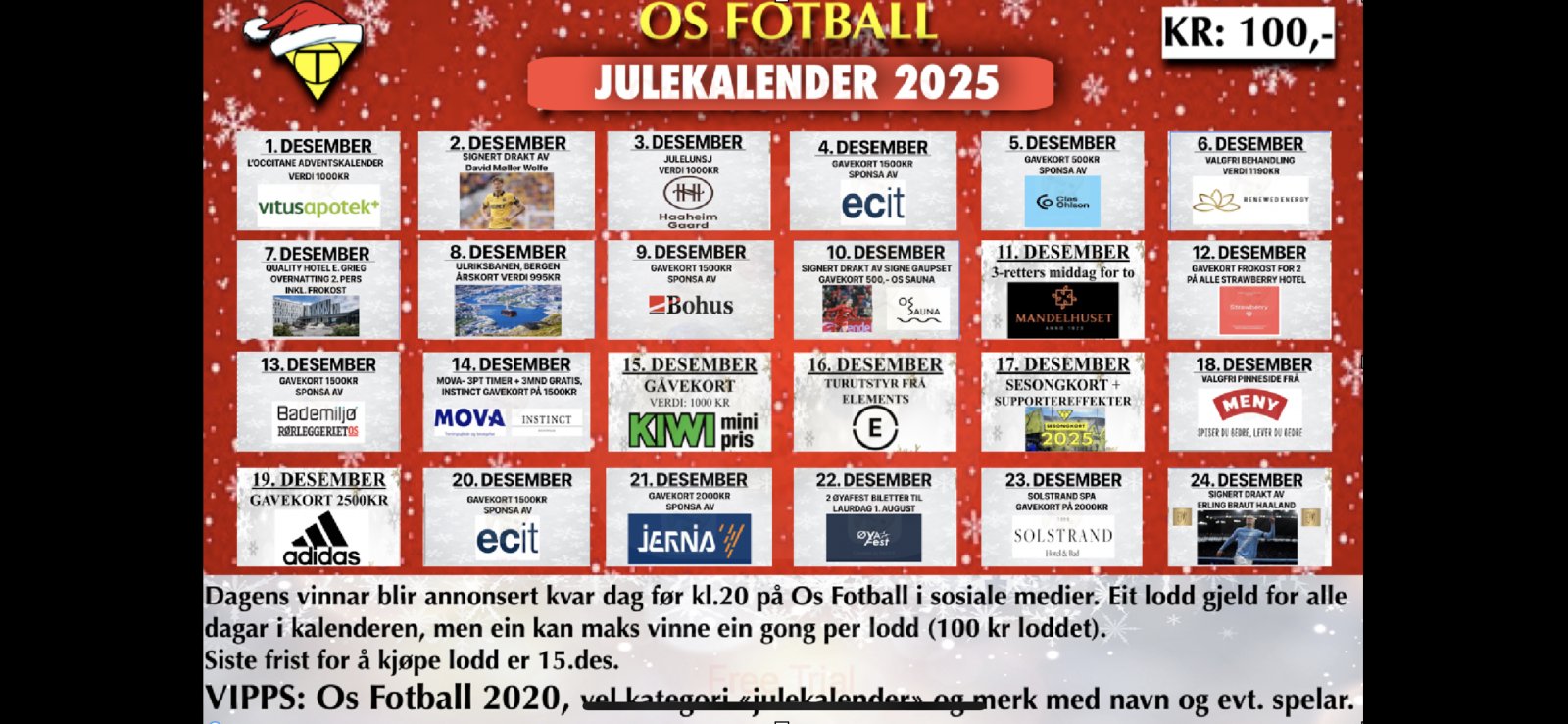 Har du ikkje kjøpt lodd enno, er det ikkje for seint! Fram til 15.desember kan du vippse kr.100 per lodd til "Os Fotball 2020", velg kategori "Julekalender", og merk med lodd-navn og evt. spelar i Os. Spelaren får salget på lista si over solgte julekalendre, som er vår årlege dugnadssalg i fotballgruppa.